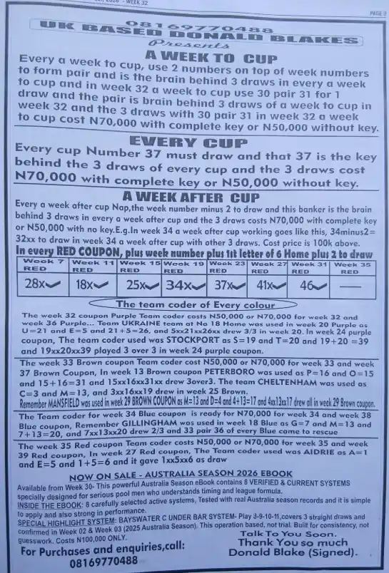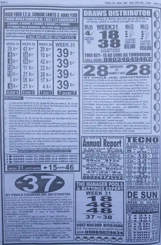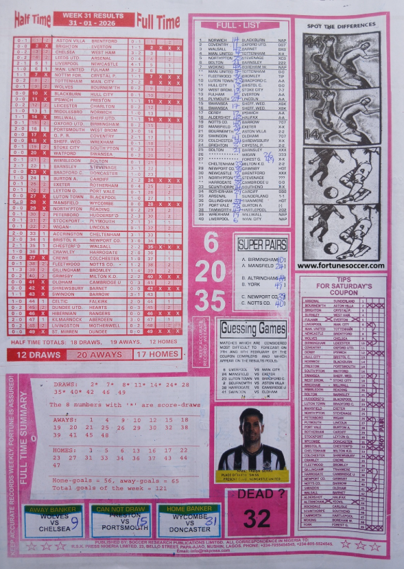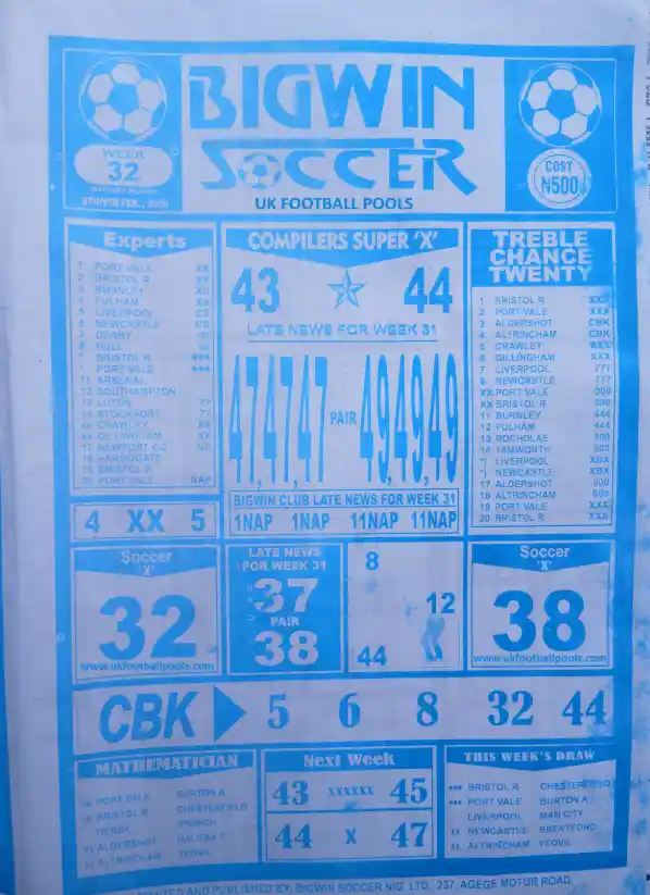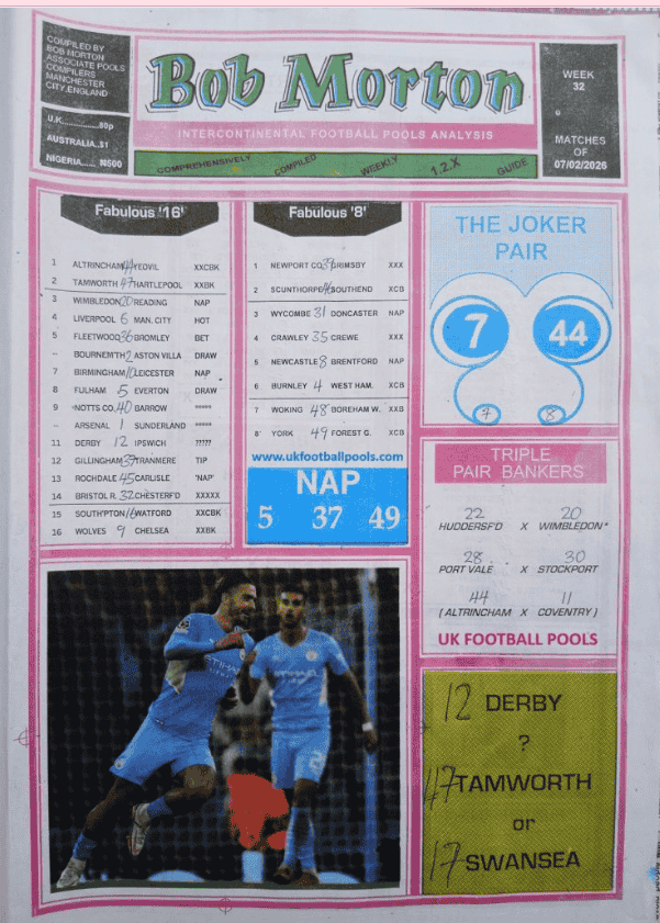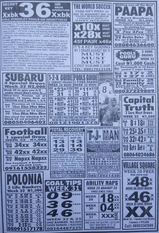 Week 32 Pools RSK Papers 2026: Feat Soccer, Bob Morton, Capital International, WinStar, and BigWin.